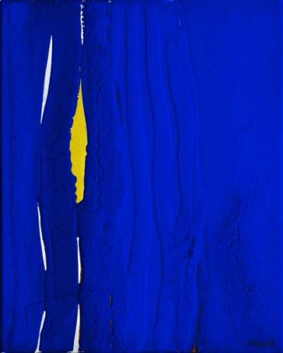 PASO aime le Rhin qui l’a vu naître, fleuve mythique, colonne vertébrale de l’Europe rhénane, creuset culturel et religieux et haut lieu de l’humanisme. Le bleu PASO, fil conducteur de cette nouvelle exposition, couleur intense et profonde, symbolise ici ces eaux légendaires qui ont toujours enflammé l’imaginaire des artistes. PASO y puise l’or qui irradie les flots, symbole de vie et trésor de sa créativité inépuisable. A l’image du drapeau européen constellé d’étoiles, les pépites d’or dans la peinture de l’artiste représentent les populations rhénanes et leurs richesses culturelles issues d’une longue histoire qui s’est construite sur les berges de ce grand fleuve.