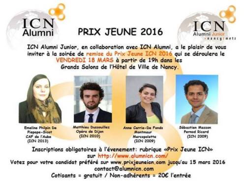 Toute l’équipe d’ICN Alumni et Alumni Junior vous invite à venir découvrir les parcours de nos quatre finalistes du Prix Jeune 2016 le 18 MARS à l’HOTEL DE VILLE de Nancy. Cette prestigieuse soirée permettra de dévoiler le nom du grand vainqueur et de lui remettre son trophée.