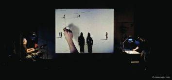 Dans leur première création, Stéréoptik, construite comme un film muet, des images s’enchaînent, s’entremêlent et se répondent au rythme de la musique. Deux histoires s’y croisent : celle de deux silhouettes qui partent découvrir le monde, et celle d’une chanteuse de jazz enlevée par des extraterrestres. Mais c’est avant tout la création d’une œuvre que l’on suit tout au long du spectacle. Chaque séquence prend forme en direct, avec d’un côté le plasticien qui élabore des dessins projetés sur écran géant, et de l’autre un homme-orchestre qui improvise en direct la création musicale à partir d’une basse, d’une guitare, d’un harmonica ou encore de claviers ou de batterie.