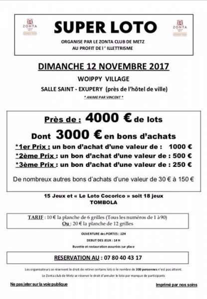 Super Loto organisé par le ZONTA CLUB DE METZ au profit de la lutte contre l’illétrisme.